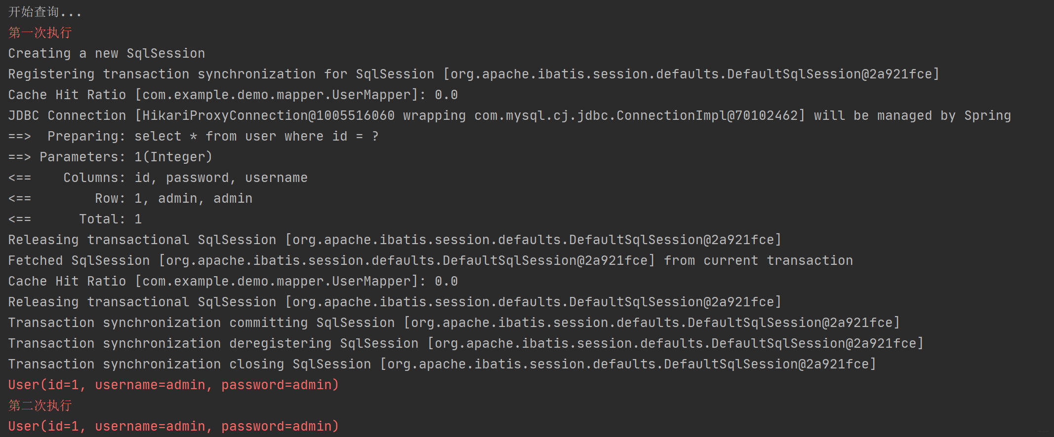 可以看到创建了一个新的SqlSession,执行了一次sql,在不开启缓存的情况下,肯定是要执行俩次sql的。