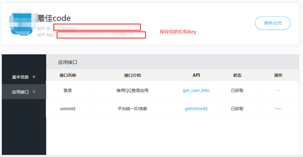 网站地址:https://connect.qq.com/,添加一个应用,具体怎么申请以及需要填写的信息,腾讯官网有详细文档。注册并完成相应信息填写后,可以在应用管理中查到应用的APP ID和APP Key。(注,这个申请还是比较麻烦的,申请了好几次,可能是脸黑吧)成功后如下图