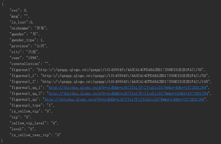 其中主要需要的是,nickname——qq名称,figureurl_qq_x——不同尺寸的qq头像,等等等等!